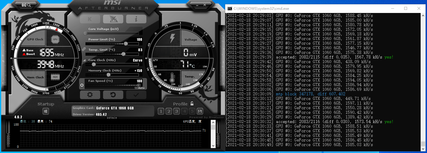 降压超显存,曲线拉了一点,显存超了一点,当然比较保守,效率也提升了一点——从1.5MH/s到了1.6MH/s,聊胜于无。